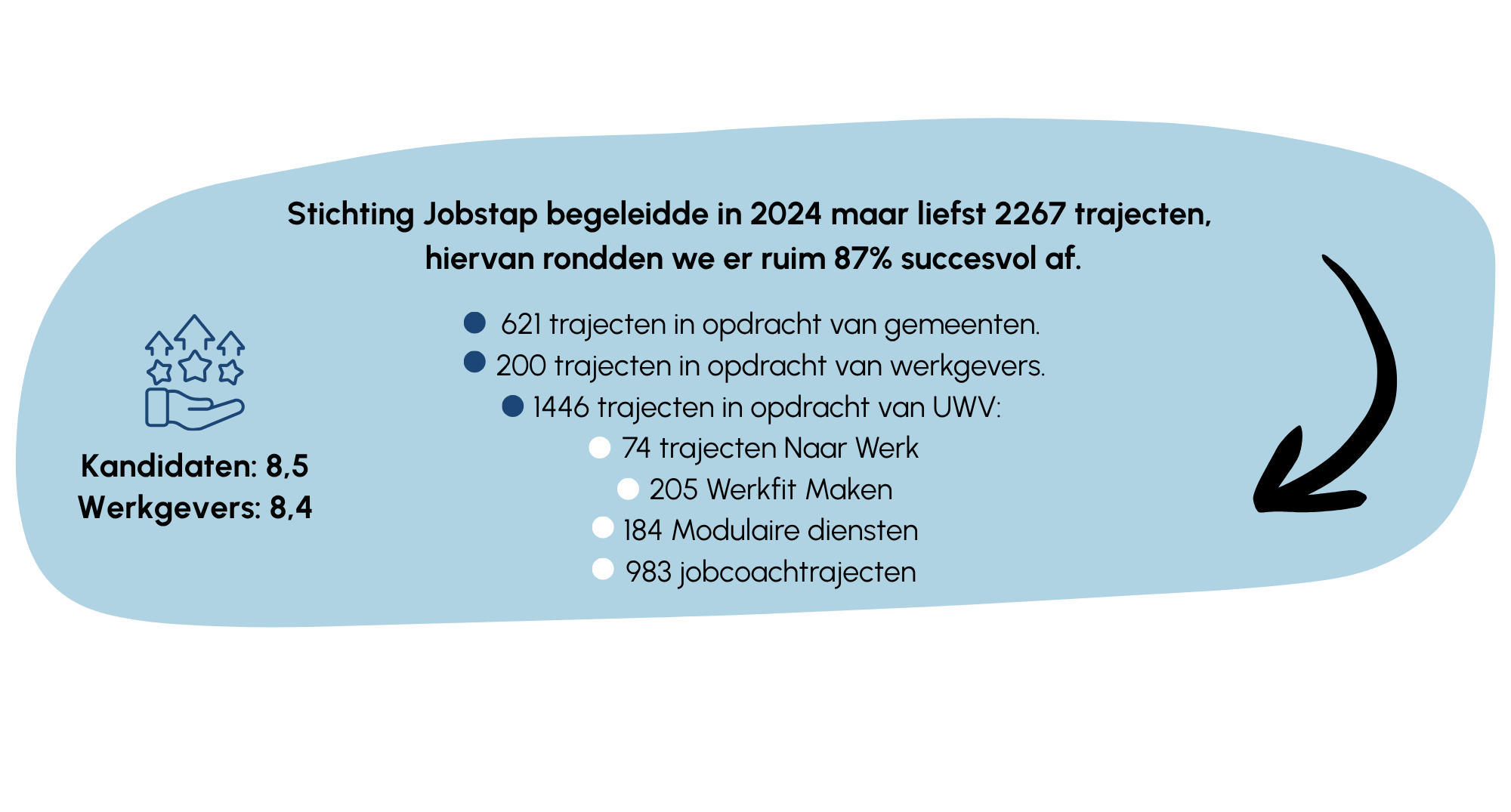 We gaan samen aan het werk - voor iedereen, op maat én met resultaat! We hechten veel waarde aan ons brede, landelijke netwerk van kandidaten, werkgevers, UWV, gemeenten, zorg- en onderwijsinstellingen, sociale partners en zusterorganisaties van de Jobstap Groep.
